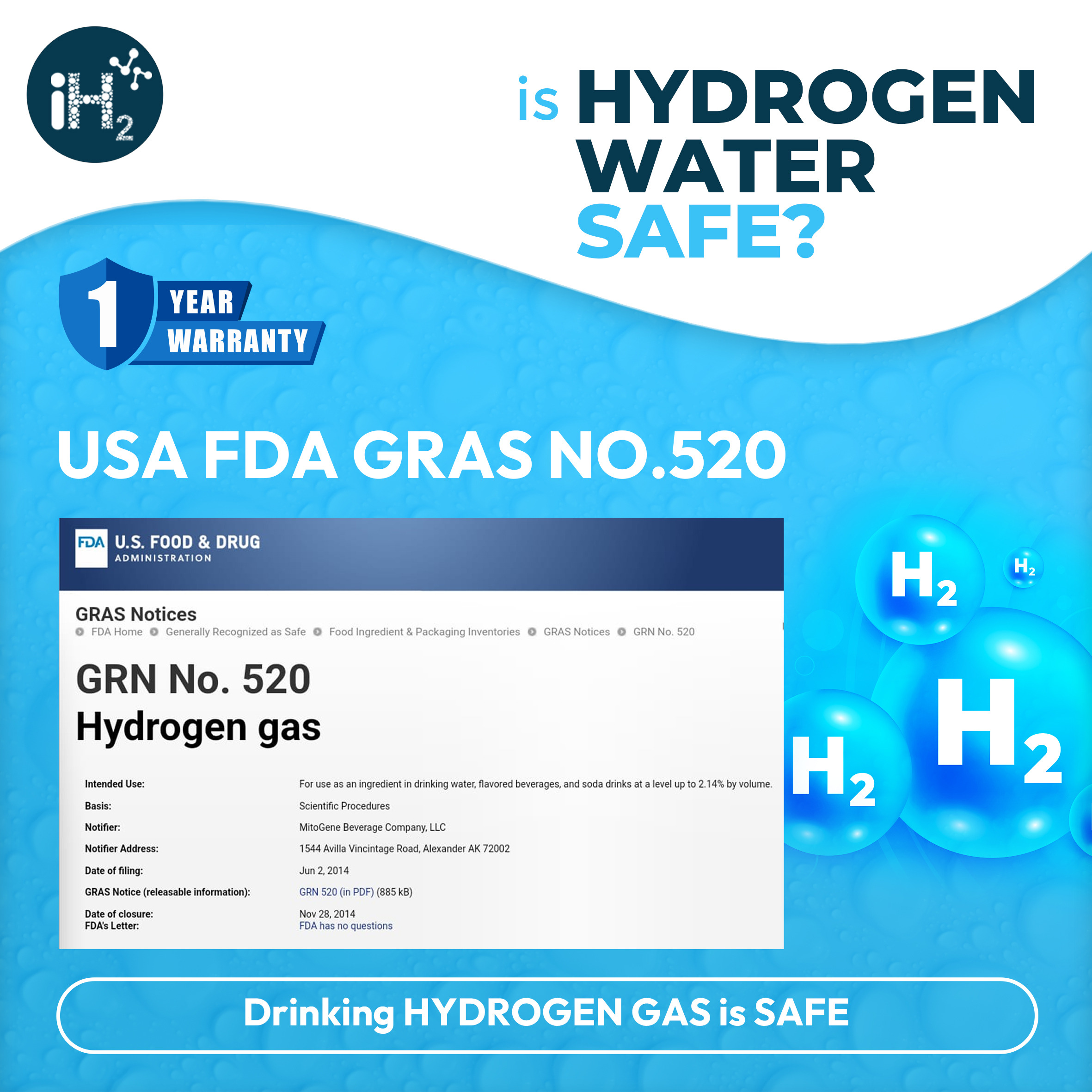 FACT No.1 :- As per the source available from USA FDA GRAS Notice 520. (GRAS means Generally recognized as safe)., wherein it was recommended that molecular hydrogen gas is been safe to consume through any beverages. So according to this source Hydrogen water is safe. But before buying any hydrogen water bottle you have to read Fact No.2